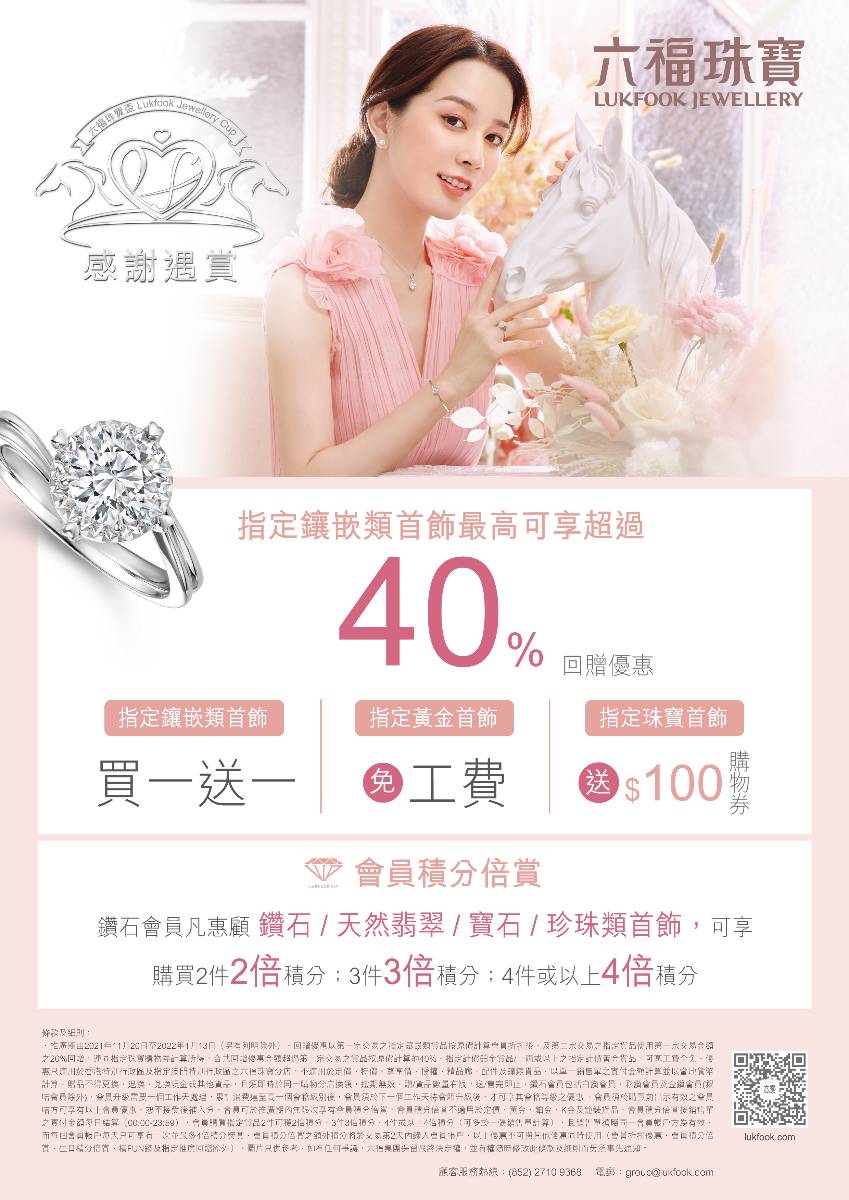 六福珠寶為你呈獻「感謝遇賞」購物優惠,即日起至2022年1月13日,於港澳指定分店可享: 指定鑲嵌類首飾可享最高超過40%回贈優惠 指定鑲嵌類首飾買一送一 指定黃金首飾工費全免 指定珠寶首飾送$100珠寶購物券 鑽石會員尊享:指定鑽石/天然翡翠/寶石/珍珠類首飾享2件2倍、3件3倍、4件或以上4倍積分獎賞 優惠只適用於港澳指定分店並以當地貨幣計算,受條款及細則約束。貨品/禮券數量有限,先到先得,售/送完即止。詳情請向港澳分店之店員查詢或參閱店內宣傳品。