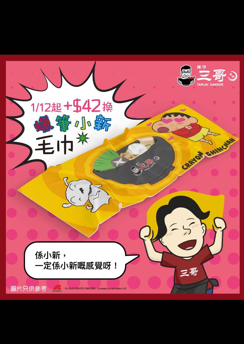 由12月1日起,只要到譚仔三哥買任何米線/薯粉,加$42就可以換購小新毛巾~數量有限,換完即止~ 條款與細則 • 必需惠顧一餸或以上米線/薯粉、推廣產品米線/薯粉或過橋米線/薯粉,每碗米線/薯粉只限換購一次。 • 請於付款時通知收銀換購禮品。 • 適用於上午11時後香港譚仔三哥全線分店。 • 圖片只供參考,最終以實物為準。 • 禮品一經換購或換領後,恕不退換或退款。 • 群順有限公司(即譚仔三哥米線)不會承擔因使用禮品時可能造成的損失所構成之任何責任。 • 數量有限,換完即止,換購或換領情況會因應個別分店而異,不設訂購或預留。 • 堂食及外賣均適用,不適用於外送平台的外賣自取及外送服務。 • 不可與其他優惠或現金禮券同時使用,外賣組合優惠除外。 • 群順有限公司(即譚仔三哥米線)保留推廣最終決定權。