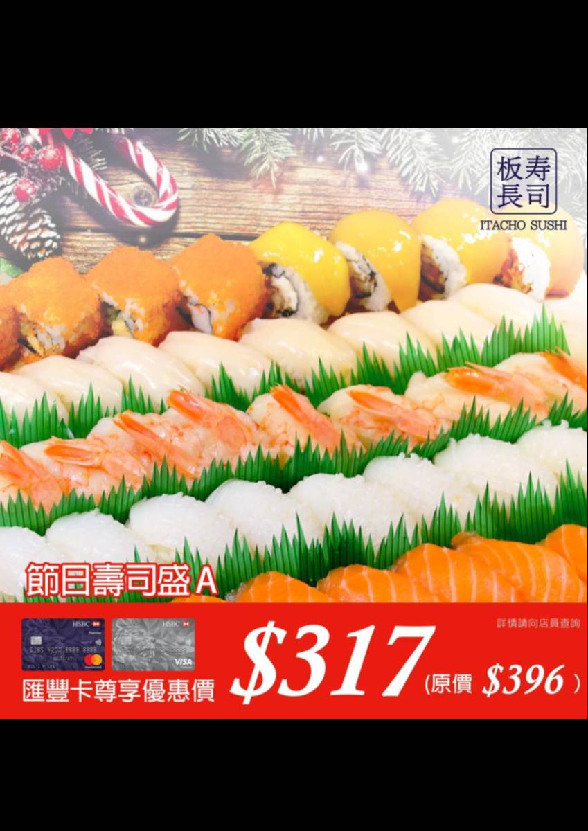 【聖誕外賣の選 – 匯豐卡尊享優惠】 依家用匯豐信用卡預訂《聖誕自取壽司刺身盛合》,並繳付全費,即享高達8折優惠!