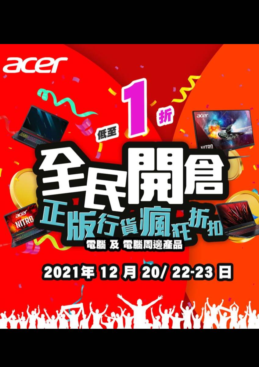 【Acer 開倉優惠再現正版行貨低至1折】 開倉必買之選 【電競螢幕】KG271 Bbmiipx 27吋 FHD 16:9 螢幕 240 Hz 螢幕刷新率 支援 AMD Free-Sync 技術 開倉價:$698 【Swift 系列】SF114-33-P1RB 1.3kg 輕薄筆電 14" FHD 窄邊框螢幕 無風扇設計 開倉價:$1,998 【抵玩筆電】A315-34-C8AR 256GB SSD + 1000GB HDD 15.6" FHD 螢幕 開倉價:$1,998