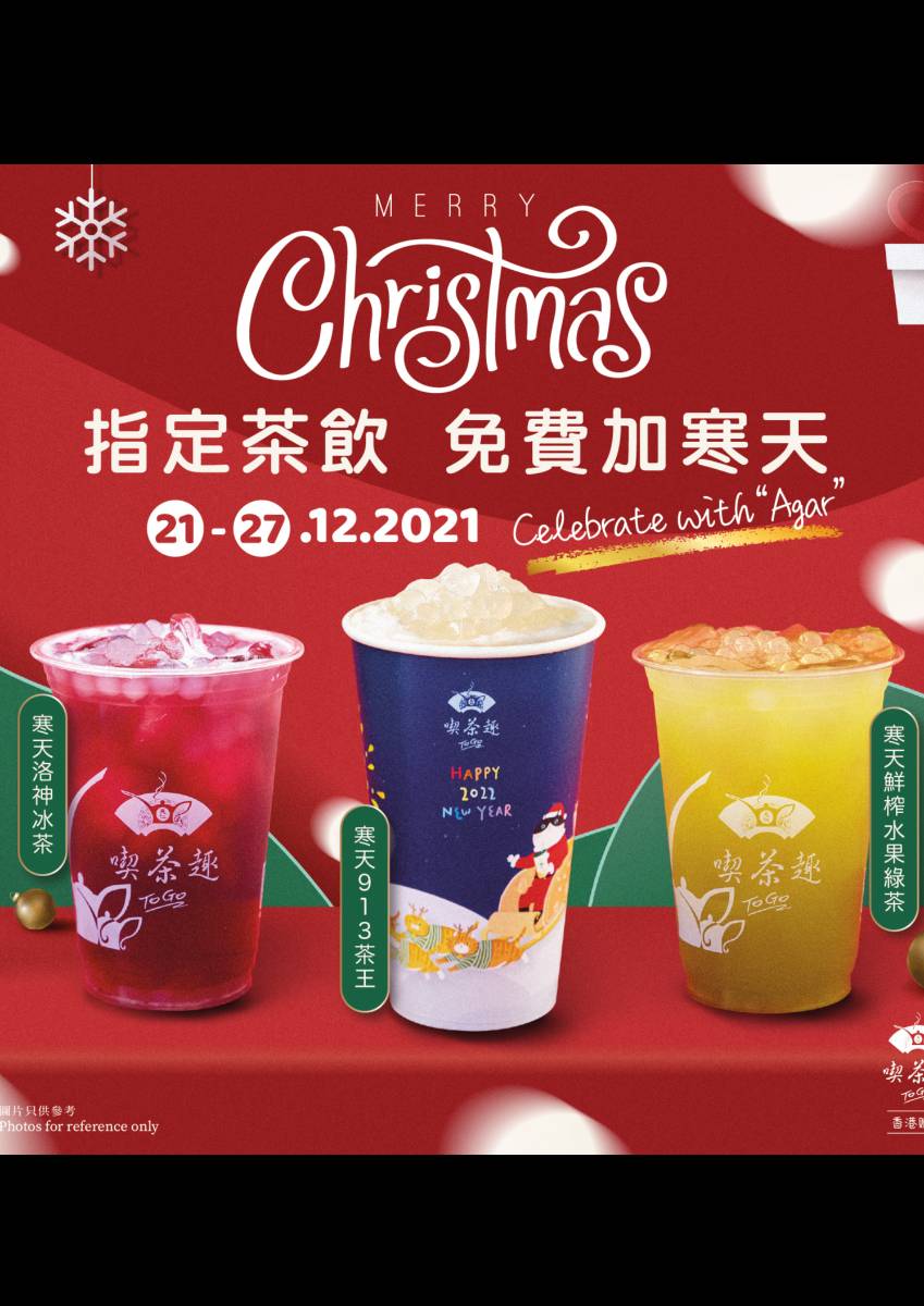 天仁為您精選三款節慶氛圍濃厚的茶飲,可免費加寒天。 ⭐️洛神冰茶 ⭐️鮮榨水果綠茶 ⭐️913茶王 ✴優惠期: 由2021年12月21日至27日✴