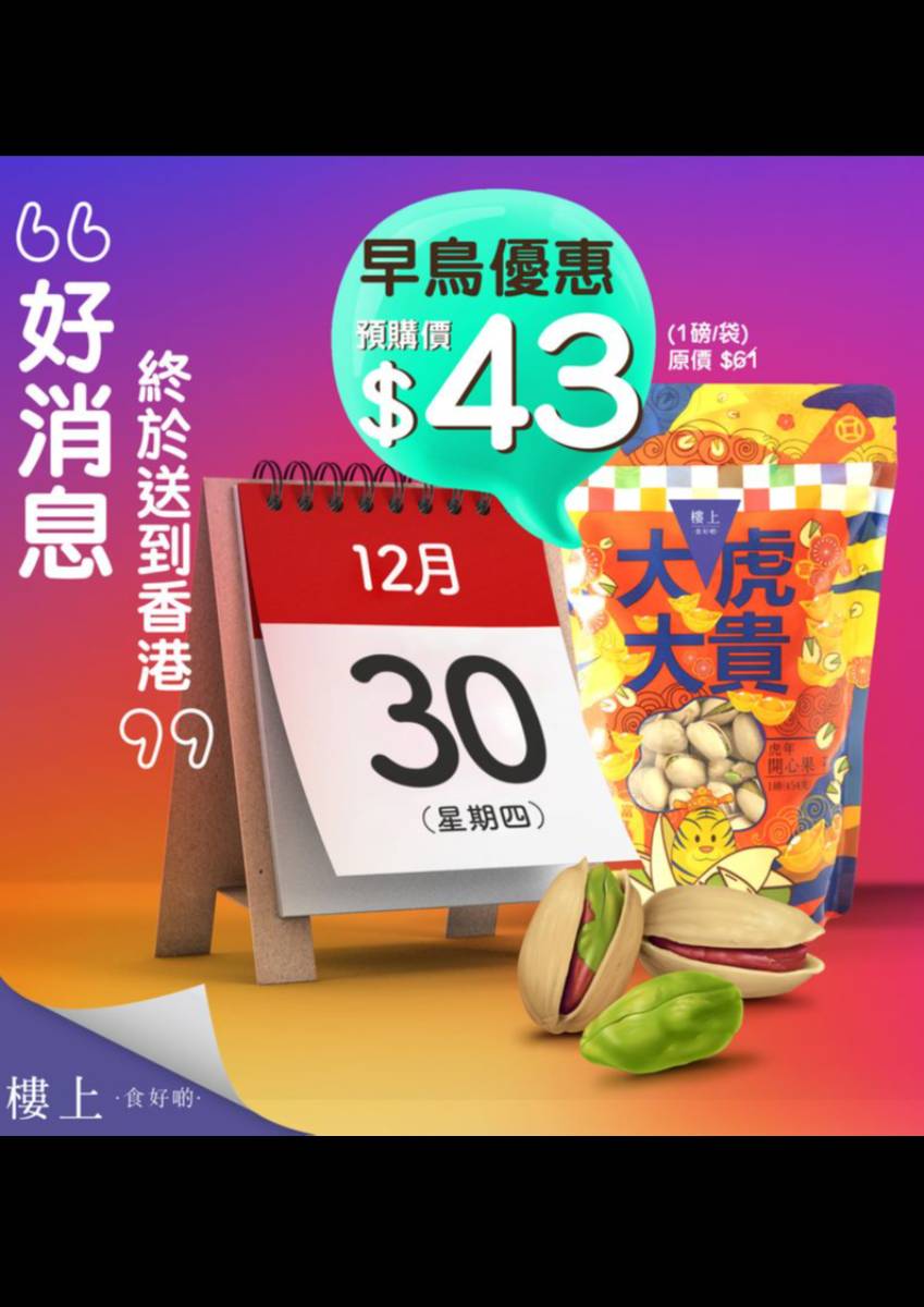 12月30日起早鳥優惠預購 $43 想知預購詳情🕚?快啲留言「#開心果早鳥優惠」,我就即刻inbox話您知📩! #一年一度 #虎年開心果 #預購 #早鳥優惠 #12月30日 #加購時令產品 #樓上 #樓上食好啲