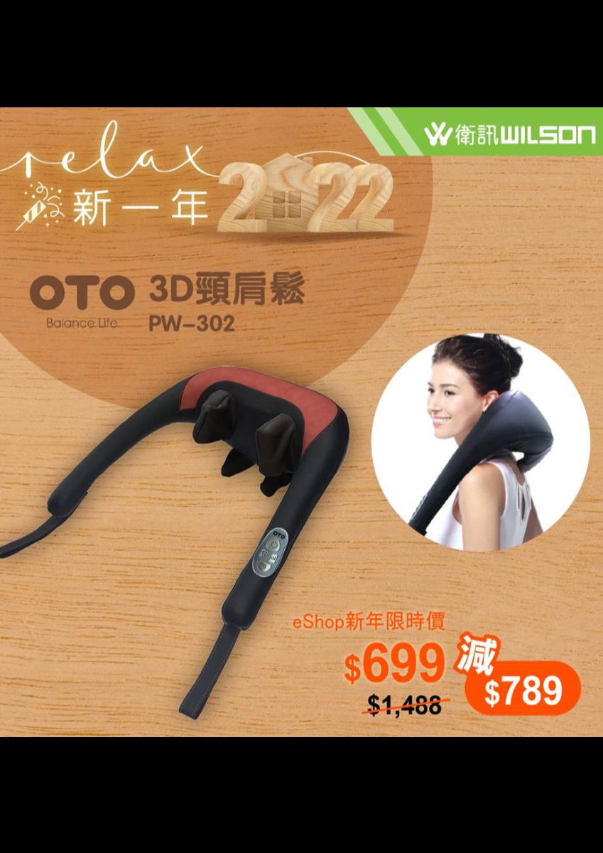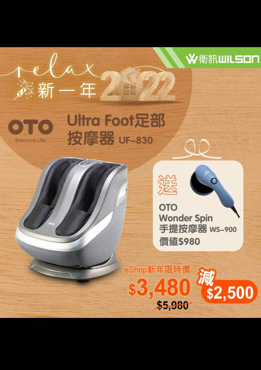 衛訊eShop入手指定OTO按摩產品有新年優惠c OTO Ultra Foot足部按摩器UF-830 新年限時價: $3,480 (建議零售價:$5,980) 送OTO Wonder Spin 手提按摩器WS-900(價值$980) OTO 3D頸肩鬆 PW-302 新年限時價: $699 (建議零售價:$1,488) 優惠期至2022年1月16日,產品/禮品數量有限,售/送完即止。優惠可能隨時更改並受條款及細則約束,詳情請參閱網站。