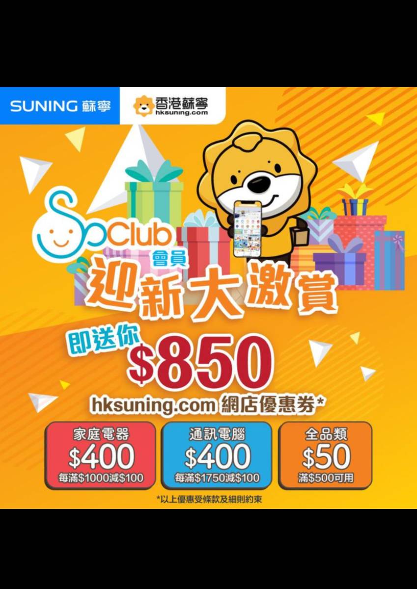 【蘇寧SoClub新會員迎新激賞】 即日起註冊成為蘇寧SoClub新會員,即可獲總值$850嘅hksuning.com網店優惠券*