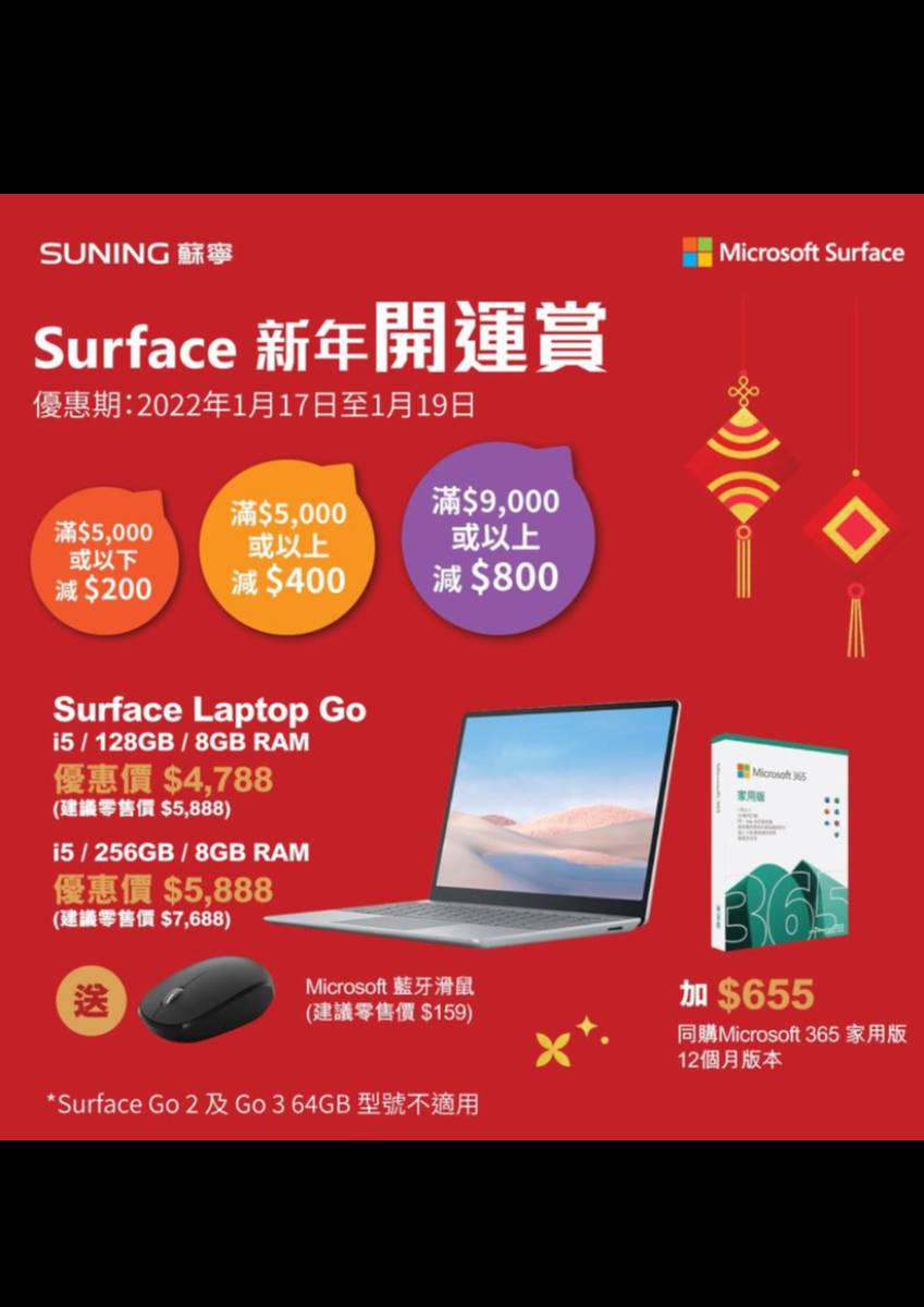 1月17至19日嚟蘇寧網店,購買指定型號嘅Surface Laptop Go即送你Microsoft 藍牙滑鼠,仲可以用 $655 加購Microsoft 365 家用版12個月版本! Surface Laptop Go i5/128GB/8GB RAM 優惠價 $4,788 Surface Laptop Go i5/256GB/8GB RAM 優惠價 $5,888