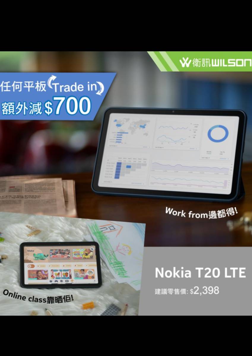 嚟衛訊各門市,只要用任何舊平板 Trade In 購買Nokia T20 LTE平板電腦,可以額外即減$700 ~ Nokia T20 LTE建議零售價:$ 2,398
