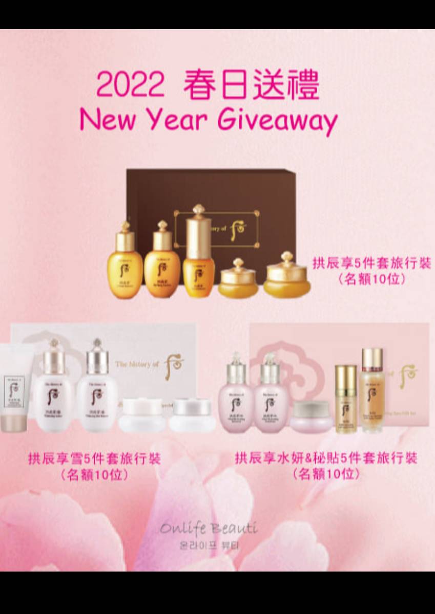 Onlifebeauti禮物大放送 只要完成以下簡單步驟 會以抽獎形式抽出30位得獎者每人將可獲得后旅行裝1份 參加方法: 1讚好「Onlifebeauti」Facebook專頁 2讚好並分享此post 獎品包括 后拱辰享5件套旅行裝 (名額10位) 后拱辰享雪5件套旅行裝 (名額10位) 后拱辰享水妍&秘貼5件套旅行裝 (名額10位) 活動詳情: 截止日期:2022年3月31日 每位參加者只限參加一次 只限香港居民參加 我們將透過inbox通知得獎者並安排寄出獎品 如有任何爭議,Onlifebeauti保留最終決定權