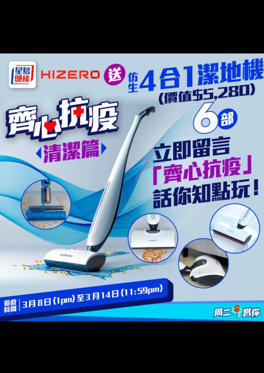 《星島頭條》APP今期「齊心抗疫 清潔篇」活動,將會激賞「HIZERO F803 仿生四合一潔地機」6部(每部價值$5,280),透過創新技術將四大清潔工序,完美合而為一,絕對係抗疫必備!如果你都得到呢個家居清潔好幫手,就要快啲搶先參加遊戲喇! 遊戲時間:3月8日至3月14日(晚上11:59) 遊戲方法: 1) 下載《星島頭條》App 並註冊成為會員 2)【讚好】星島頭條Facebook專頁 https://bit.ly/sthd-fb 及 Hizero Hong Kong Facebook專頁 https://bit.ly/HZOHK 3)【留言】「齊心抗疫」 4)我哋會即刻 PM 你遊戲表格連結 *《星島頭條》對活動一切安排保留最終決定權