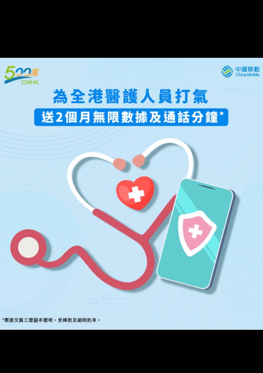 【為醫護盡一分力 送2個月無限本地數據及通話分鐘】 抗疫路上,我哋絕不孤單。CMHK非常感激所有醫護人員一直緊守崗位及無私付出,與港人一齊度過難關。 為答謝所有醫護人員,只要你哋致電熱線2945 8883,CMHK就會為你送上2個月無限本地流動數據及通話分鐘*,讓你喺非常時期,依然可以與摯愛保持聯繫。 *需提交員工證副本證明。受條款及細則約束。