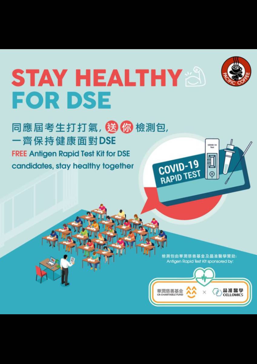 疫情下,為咗支援考生,喺3月18日至4月4日期間,會喺指定店舖派發快速測試包。應屆考生可以憑DSE准考證或有效中六學生證到指定分店領取2盒快速測試包,每張准考證可領取一次。定期測吓,人都安心啲,希望大家都健健康康,考出佳績! 指定分店如下(請參閱App內詳細分店地址): 香港島:灣仔東城大廈、太古城中心 九龍:又一城LG2層 、黃大仙中心北館 新界東:沙田連城廣埸、 將軍澳東港城 新界西:綠楊坊、屯門市廣場一期
