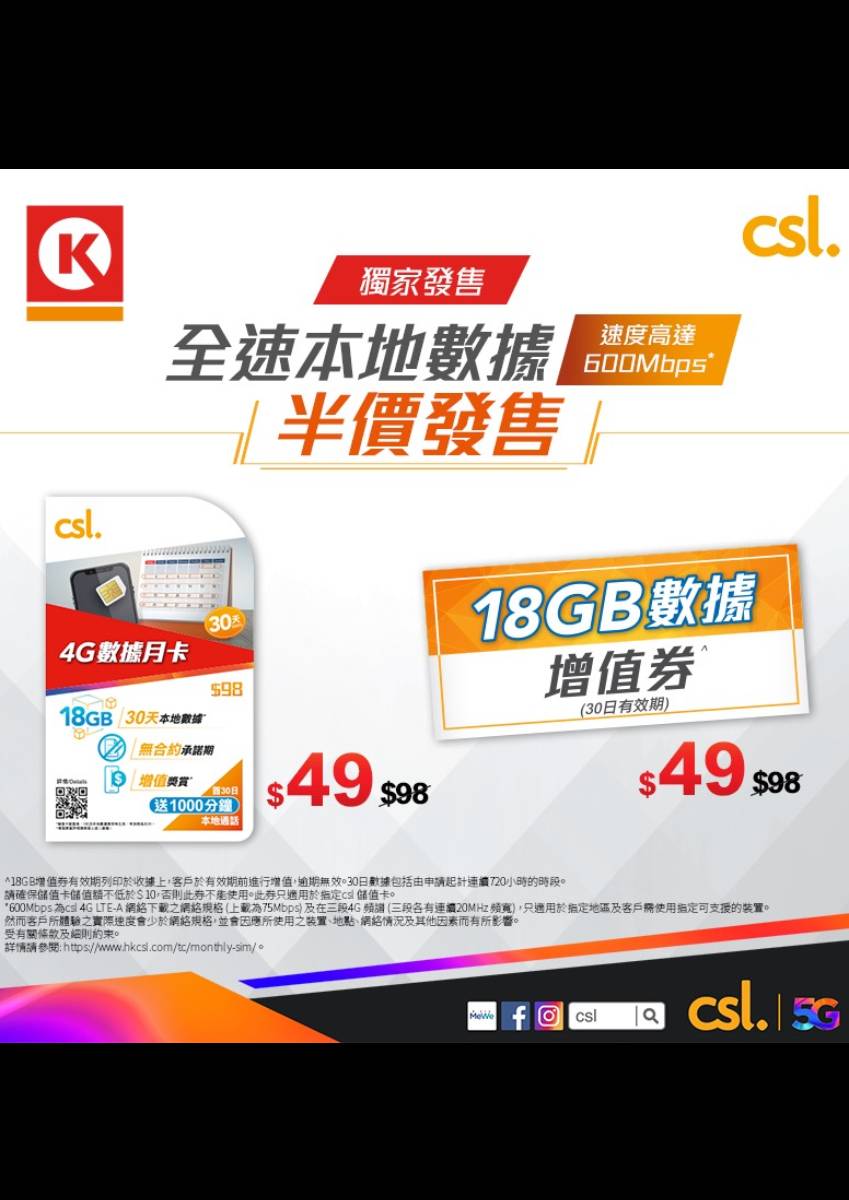 【獨家發售: csl 4G本地數據低至$49/月】 csl 4G數據月卡有18GB 本地數據,可以隨時隨地享受極速網絡,唔駛怕數據唔夠用!開卡仲送有免費1000分鐘本地通話。而家係OK便利店可以半價$49購買1張 (原價: $98/張)。 現有指定csl 儲值卡客戶有需要嘅話都可以購買18GB/30日數據增值券^,OK便利店獨家發售,半價$49購買1張 (原價 : $98/張)。 優惠期至4月20日。數量有限,售完即止。