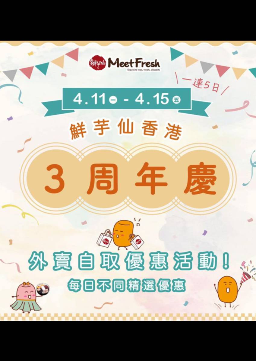 《一連5日》全線門市外賣自取精選優惠 為慶祝鮮芋仙香港踏入3周年 由4月11日至15日期間,鮮芋仙將每日推出不同限定優惠 鮮芋仙全線門市外賣自取精選優惠 2022年4月11日 (星期一) 優惠內容:凡惠顧任何配料,即可以$3加購第二份配料 2022年4月12日 (星期二) 優惠內容:凡惠顧價錢含有3字之產品即可享半價優惠 2022年4月13日 (星期三) 優惠內容:凡惠顧3號產品,第二碗3號產品即可以半價加購 2022年4月14日 (星期四) 優惠內容:凡惠顧招牌仙草冰沙即減$3 2022年4月15日 (星期五) 優惠內容:以優惠價$33購買台式紅豆牛奶冰之新組合 條款及細則: ※ 僅限於門市外賣自取,不適用於堂食及外送服務 ※ 不可與其他優惠同時使用 ※ 數量有限,售完即止 ※ 圖片僅供參考,以實物為準 ※ 如有任何爭議,鮮芋仙香港保留最終決定權 詳情請點擊連結!