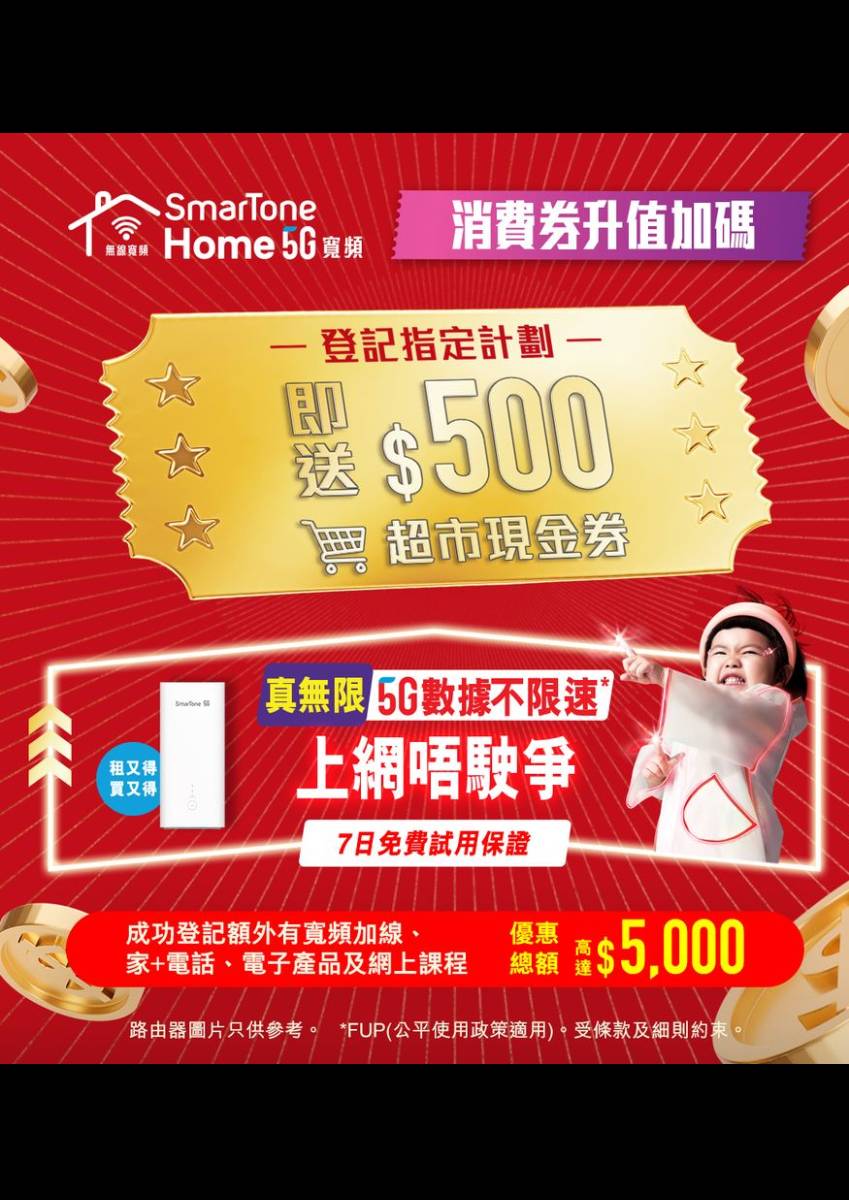 打算用消費券升級家中網絡,享受穩定流暢上網體驗?而家上Home 5G寬頻計劃消費券即升值加碼,豪送以下總值高達$5,000優惠^: $500超市現金券 7折申請第2個Home 5G寬頻服務 享67折申請家+電話服務 低至62折入手精選主動降噪無線耳機或7折買Wi-Fi 6 路由器 7折選購學生網上課程/電子圖書/視像補習服務 免拉線 兼 廳房插電即用 嘅Home 5G寬頻包無限5G數據*,唔使約師傅上門拉線,方便你加個私人寬頻用嚟煲劇睇戲或上網課,全家以後唔使再爭上網! 仲特設 免費7日試用保證! 詳情請點擊連結!