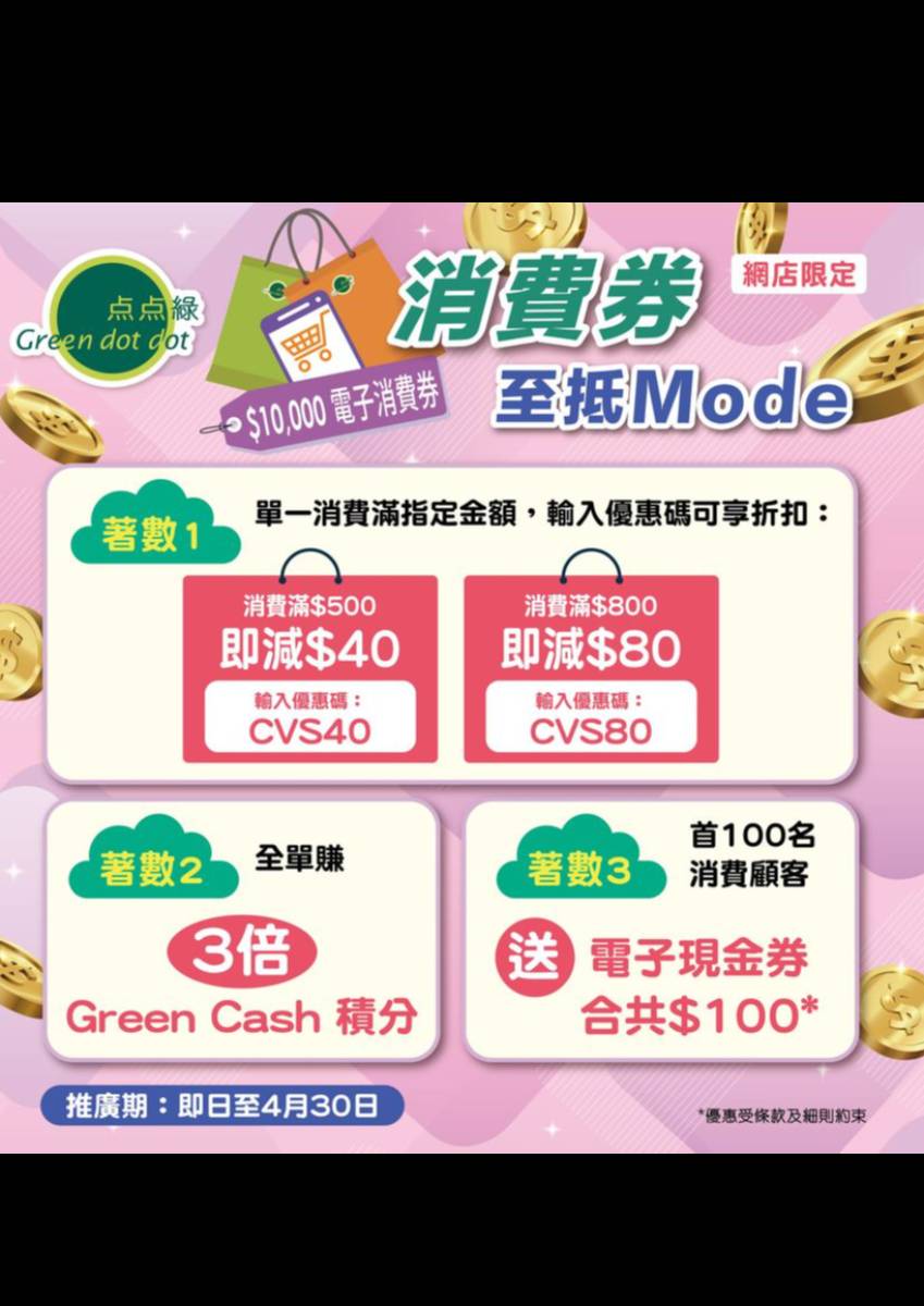 新一輪消費券優惠又嚟了!点点綠網店消費券優惠大放送,開動 //消費券至抵Mode// ,買天然有機食品,強身健體,賺錢賺健康! 滿額輸入以下優惠碼,即享折扣優惠: 滿$500減$40【CVS40】 滿$800減$80【CVS80】 全單賺3倍積分($1=3分) 首100名消費顧客額外送電子現金券合共$100*(以電郵發送) 詳情請點擊連結!