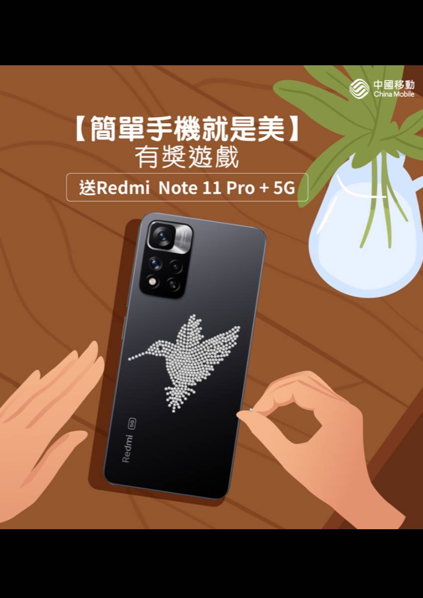 【簡單手機就是美】有獎遊戲 依家答問題玩遊戲,分享得最有心思嘅1位參加者,就可以贏到Xiaomi Redmi Note 11 Pro + 5G手機一部,體驗極簡之美 遊戲問題:分享一個以前用過嘅裝飾手機方法 獎品:Xiaomi Redmi Note 11 Pro + 5G 手機 乙部(名額:1名)(建議零售價 $3,299) 遊戲玩法: 1.「Like/讚好」此Post及本專頁 China Mobile Hong Kong 2. 喺呢個Post留言回答以上遊戲問題(答案不可多於100字,標點符號計算在內。) 3. 喺留言Tag最少3位朋友 答案最特別嘅1位參加者將獲贈以上獎品,每位得獎者只可獲獎一次。 詳情: 活動截止日期: 2022 年6月8日 23 時 59 分 詳情請點擊連結!