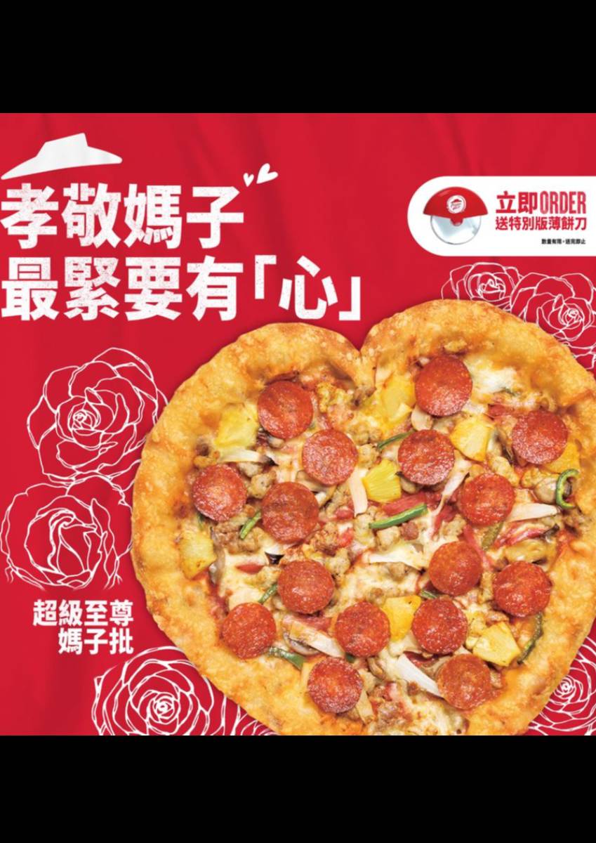 【 超級至尊媽子批駕到 】 今個母親節,要好好孝敬至尊無上嘅媽子,當然要有夠至尊嘅驚喜 — 「超級至尊媽子批」! 特製嘅心形芝脆批邊,配上火腿、辣肉腸、豬肉粒、牛肉粒、菠蘿等超級至尊嘅滋味配料,唔只有心意,仲夠晒新意,媽媽收到一定心心眼呀! 單點或者套餐都有得揀架! 而家落單仲送特別版薄餅刀,數量有限,送完即止,快啲嗌返個同超級至尊媽子一齊歎吓啦!