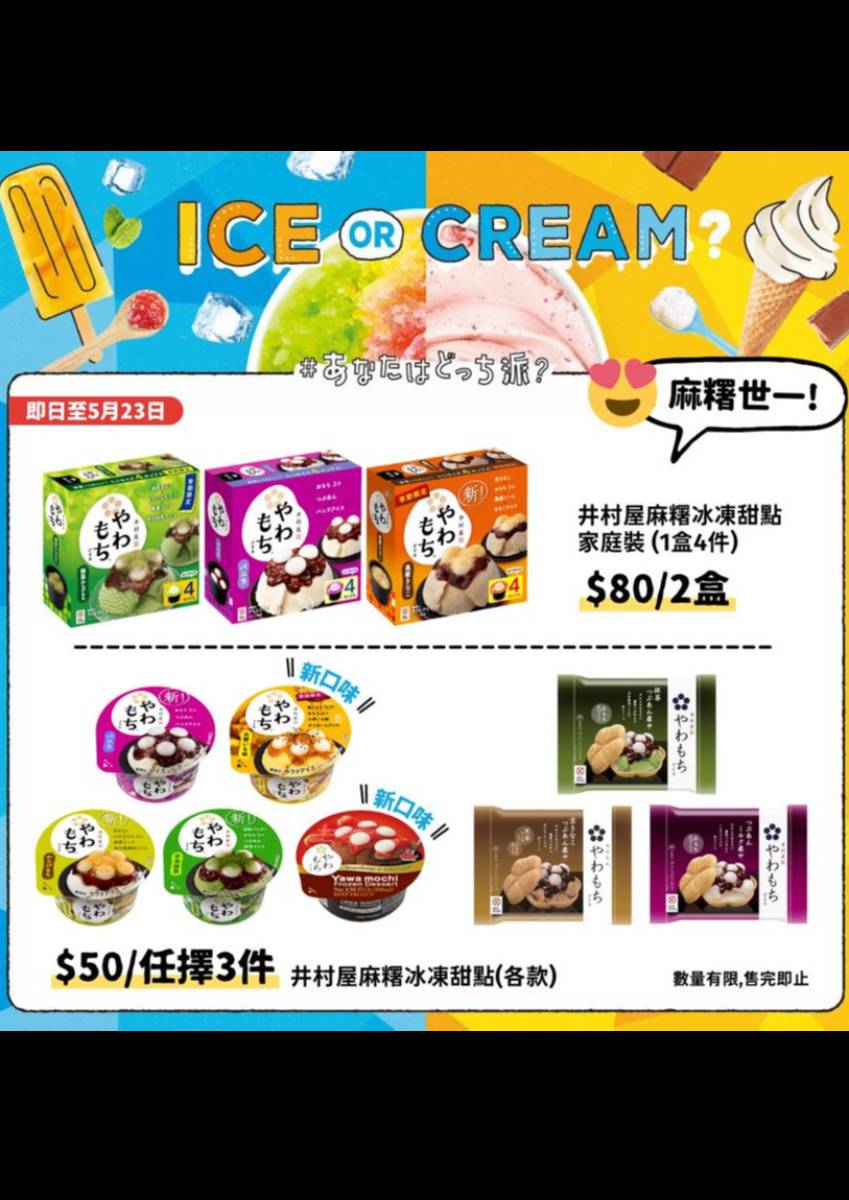 小編又有快閃優惠消息啦煙煙韌韌嘅麻糬甜品一向受歡迎配埋雪糕更加無得輸🇯🇵日本百年甜品老店井村屋出品嘅麻糬雪糕喺室溫退冰5分鐘麻糬就會回復返Q彈口感除咗日式傳統定番抹茶、紅豆、黃豆粉味之外仲有較少見嘅新口味 地點:全線一田超市 日期:即日至5月23日 數量有限,售完即止 詳情請點擊連結!