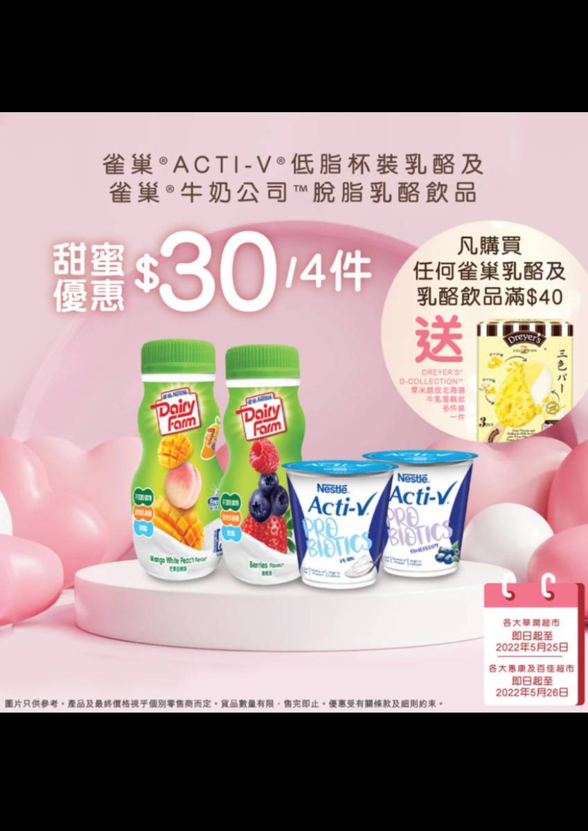 雀巢®ACTI-V®低脂杯裝乳酪及雀巢®牛奶公司™脫脂乳酪飲品|520甜蜜優惠$30/4件 520係表達愛意好時機,好好享受Friday Night嘅二人世界,放工後行超市買餸煮飯仔,仲可以用520甜蜜優惠$30/4件買定雀巢®ACTI-V®低脂杯裝乳酪及雀巢®牛奶公司™脫脂乳酪飲品,一人一杯,錫住對方,仲錫住腸胃,一齊勁浪漫,超溫馨! 優惠期及銷售點 各大華潤超市:即日起至2022年5月25日 各大惠康及百佳超市:即日起至2022年5月26日 凡購買任何雀巢乳酪及乳酪飲品滿$40,即送 DREYER’S® D-COLLECTION™ 粟米脆皮北海道牛乳雪糕批多件裝一件,醒你至抵Shopping方法:只需$60就可以帶走8件杯裝乳酪 + 1盒雪糕批喇! 產品於全港指定超級市場有售。產品及最終價格視乎個別零售商而定,數量有限,售完即止。如有任何爭議,雀巢香港有限公司保留最終決定及解釋權。