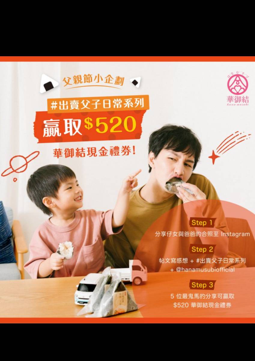 父親節小企劃:出賣父子日常系列 等你贏取$520華御結現金禮券! 據非正式統計,爸爸通常有較獨特的育兒方式,會同小朋友一齊不顧儀態,整蠱作怪,總之有其父必有其子,造就出最惹笑又窩心的溫暖時刻!因此,華御結於6月10日至20日推出「父親節小企劃:出賣父子日常系列 」,誠邀各位家長分享仔女同爸爸神情或動作一致的照片,再加上一句感想。經華御結團隊選出最鬼馬的分享,就可以獲得$520華御結現金禮券(名額5名)! 參加辦法: 1 : 在Instagram分享仔女與爸爸的合照並發佈為帖文。帳戶須設定為公開。 2 : 於帖文寫下感想,加 出賣父子日常系列,及 @hanamusubiofficial。 3 : 最鬼馬的分享可獲得$520華御結現金禮券(名額5名)。 得獎名單將會於2022年7月8日或之前公布。 詳情請點擊連結!